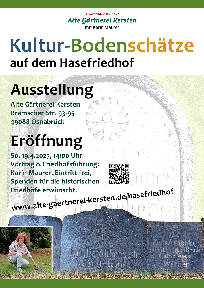 In einer Ausstellung in der Alten Gärtnerei Kersten stellen wir den Hasefriedhof und die neu- oder wiederentdeckten Gräber vor. Eröffnung: 19.4.2025, 14:00 Uhr.