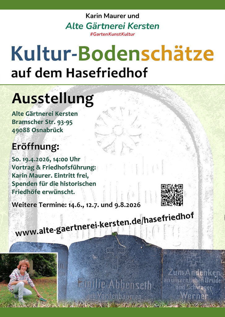 Ausstellungseröffnung mit Vortrag und Friedhofsrundgang am 19.4.2026. Fast 300 alte Gräber, die die Natur zurückerobert hatte und die in Vergessenheit zu geraten drohten, hat die „Grabbuddlerin“ Karin Maurer in den vergangenen Jahren auf dem historischen Haserfiedhof gegenüber unserem Gärtnereigelände ausgegraben…. weiterlesen