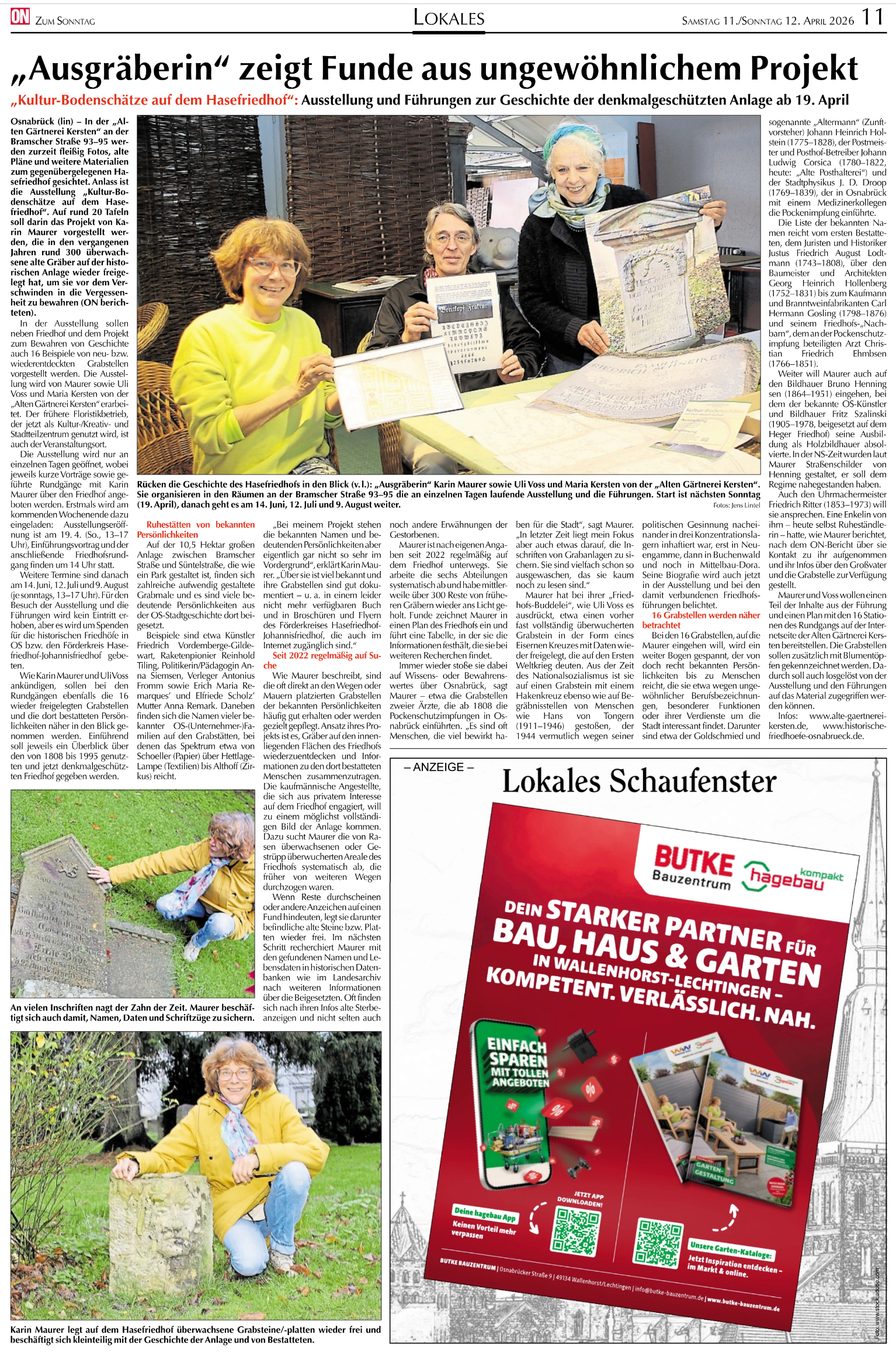Die ON berichtete am 11.4.2026 über die Kultur-Bodenschätze. Großansicht per Mausklick. Link zum Beitrag: www.lokale-wochenzeitungen.de/osnabruecker-nachrichten/e-paper/. Bildrechte: Jens Lintel.