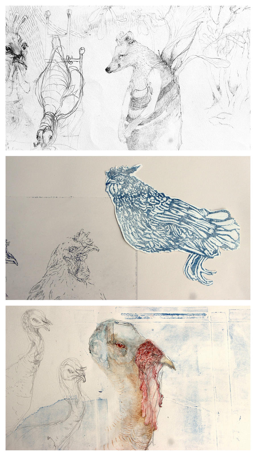 In meiner künstlerischen Tätigkeit arbeite ich projektmäßig an Büchern. In diesem Prozess entstehen Zeichnungen. Die liegen allen anderen Arbeiten zugrunde und ergeben eine Bildsprache, eine erzählerische, fragmentierte Schrift. Zu sehen sind viele mehr oder weniger erkennbare Tiere (wie Vögel, Füchse, Truthähne, Gänse, Pelikane, Bären, Hummeln usw.) Oder auch hybride Wesen, Natur, organische Formen, Bäume, Tiefe, Augen, Wind. Es fließt ineinander über. Alles ist hier möglich, alles darf hier sein.